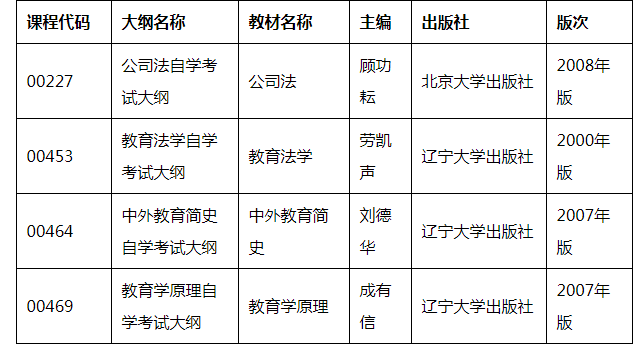 受新冠肺炎疫情影响,原计划于2020年10月自学考试启用的《教育学原理》《教育法学》《中外教育简史》《公司法》等4门课程新版大纲和教材(参见《关于2020年高等教育自学考试全国统考课程考试安排有关事项的通知》)暂缓执行。2020年10月份自学考试上述课程仍使用之前版本教材。具体如下: