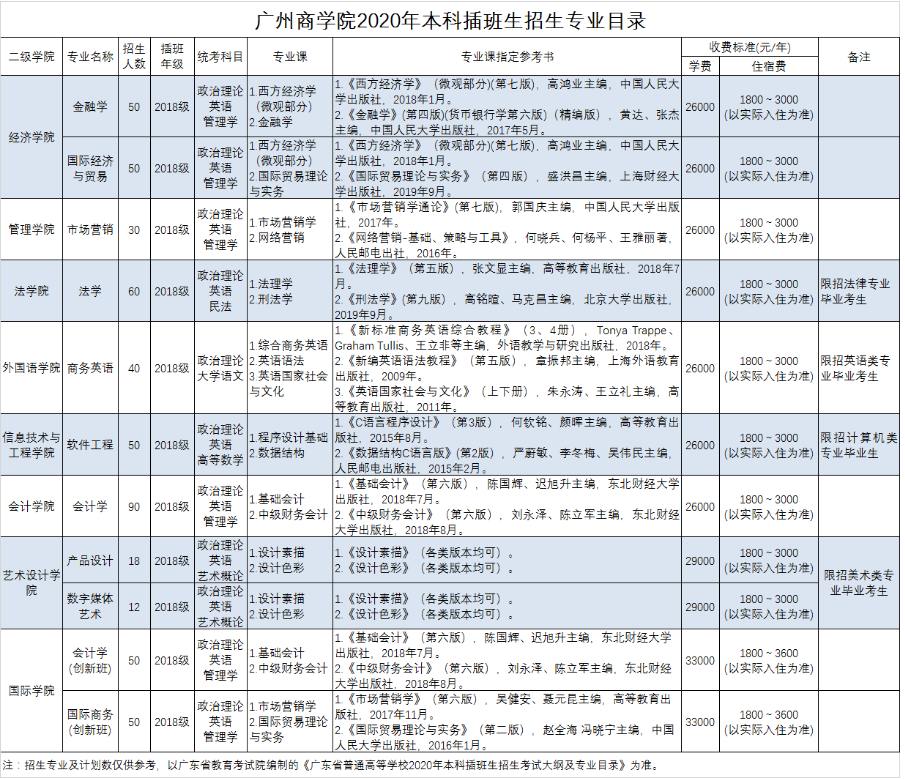 广东专插本在这里以广州商学院2020年本科插班生专业目录为例子:
