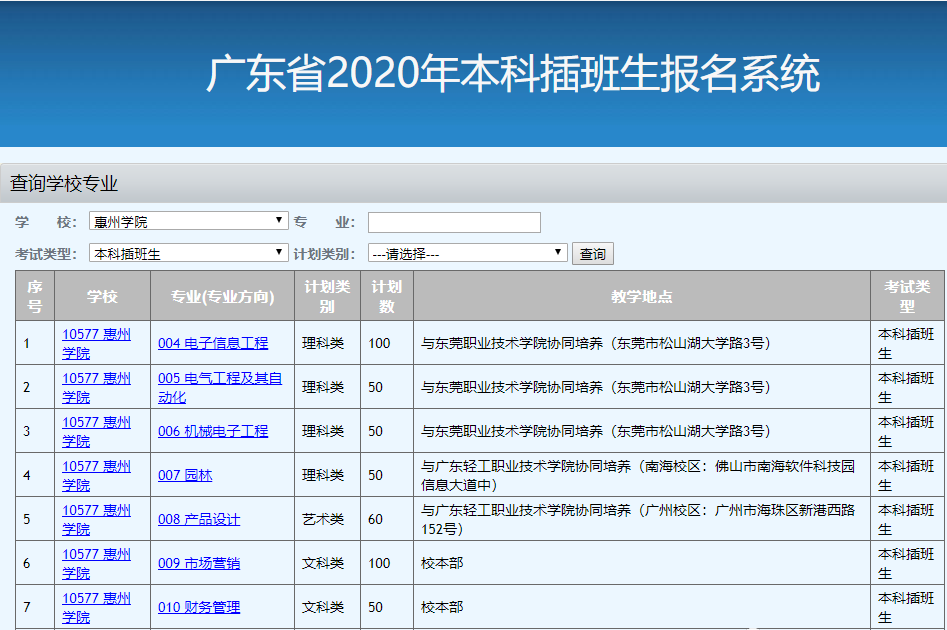 在广东专插本补报名的时候,可以之间报学校相应的专业,后面会注明校区,大家在进入广东省本科插班生报名系统,选择筛选考试类型“本科插班生”之后,留意“教学点”下的地址。如果是本科学校的插本而在专科校区上学的话,就是联培计划了。