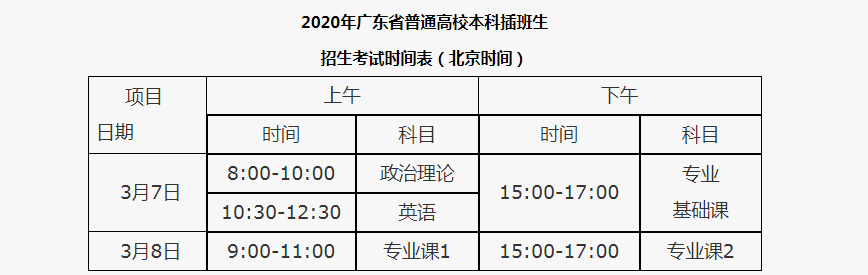 (五)普通高校本科插班生招生考试时间为2020年3月7日(星期六)至8日(星期日)两天,具体安排见下表: