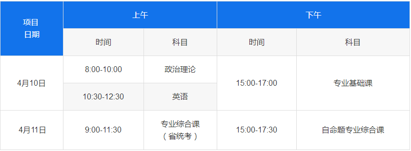 (二)普通专升本招生考试时间为2021年4月10日(星期六)至11日(星期日)两天,具体安排见下表: