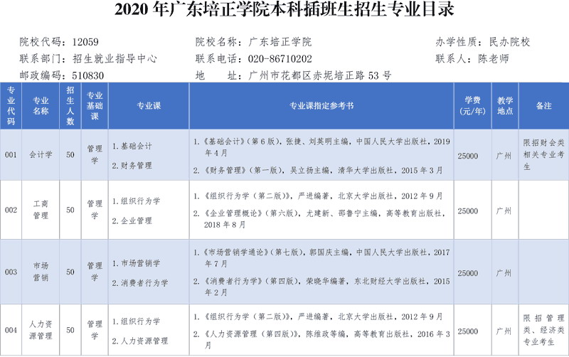 广东专升本 >统招专升本 > 专业目录 > 2020年广东培正学院本科插班生招生专业目录