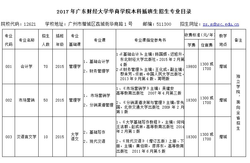 2017年广东财经大学华商学院本科插班生招生专业目录