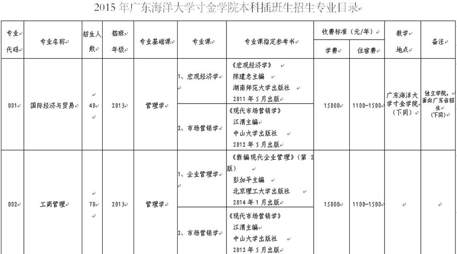 2015年广东海洋大学寸金学院本科插班生招生简章
