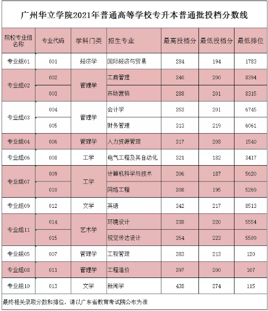 2022年广州华立学院普通专升本投档线(参照2021年)