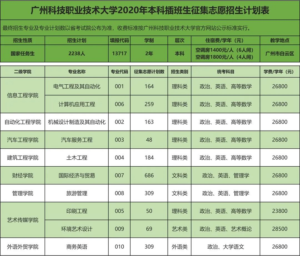 广州科技职业技术大学有10个专业,2238个计划,参加专插本征集志愿。征集志愿(补录)时间:2020年7月31日(具体以广东省教育考试院通知为准)。